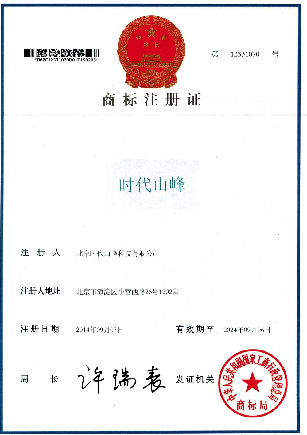 商标"时代山峰"注册成功!